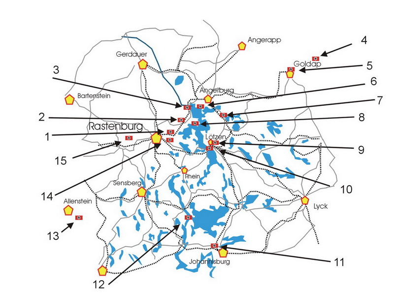 Präsentationsbereich Reichsmarschall Hermann Göring; #5 Goldap, zweite Bunkeranlage (OKL) Reichsmarschall Göring; #6 Am „Schwenzaitsee“ Unterbringung Mitarbeiterstab Ribbentrop; #7 Bunkeranlage f. Heinrich Himmler und Stab, Tarnname „Hegewald“; #8 Barockschloss Steinort, benutzt für Außenminister Ribbentrop; #9 Hindenburg-Kaserne Lotzen, Sitz Nachrichtenaufklärung (OKH) „Fremde Heere Ost“; # 10 „Festung Boyen“ Sitz des Ärzteteams für Hitler und Spionageabwehr (Kriegsgefangenenlager); #11 Johannisburg, erste Bunkeranlage Oberkommando der Luftwaffe (OKL); #12 Nikolaiken, Abwehr „Walli 2“; #13 Bei Allenstein – Telefonzentrale Tarnname „Annabu“ #14 Flugplatz der Wolfsschanze; #15 Heiligelinde, Abgesetzte Funkstelle.